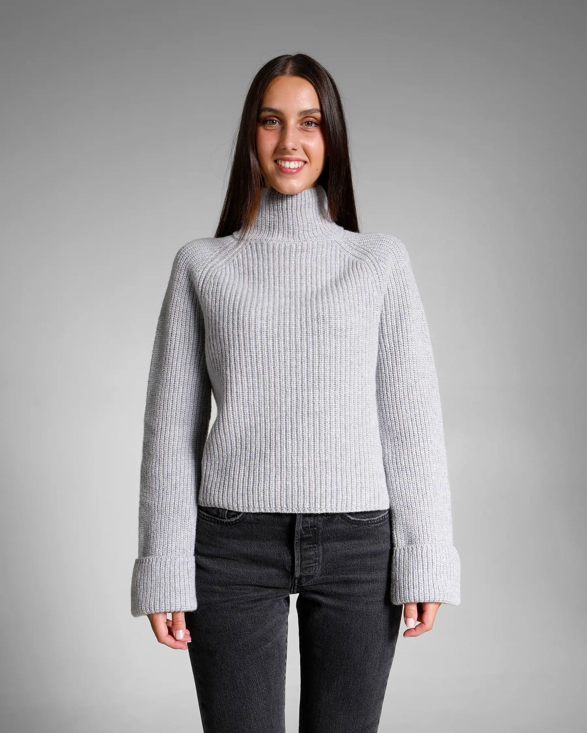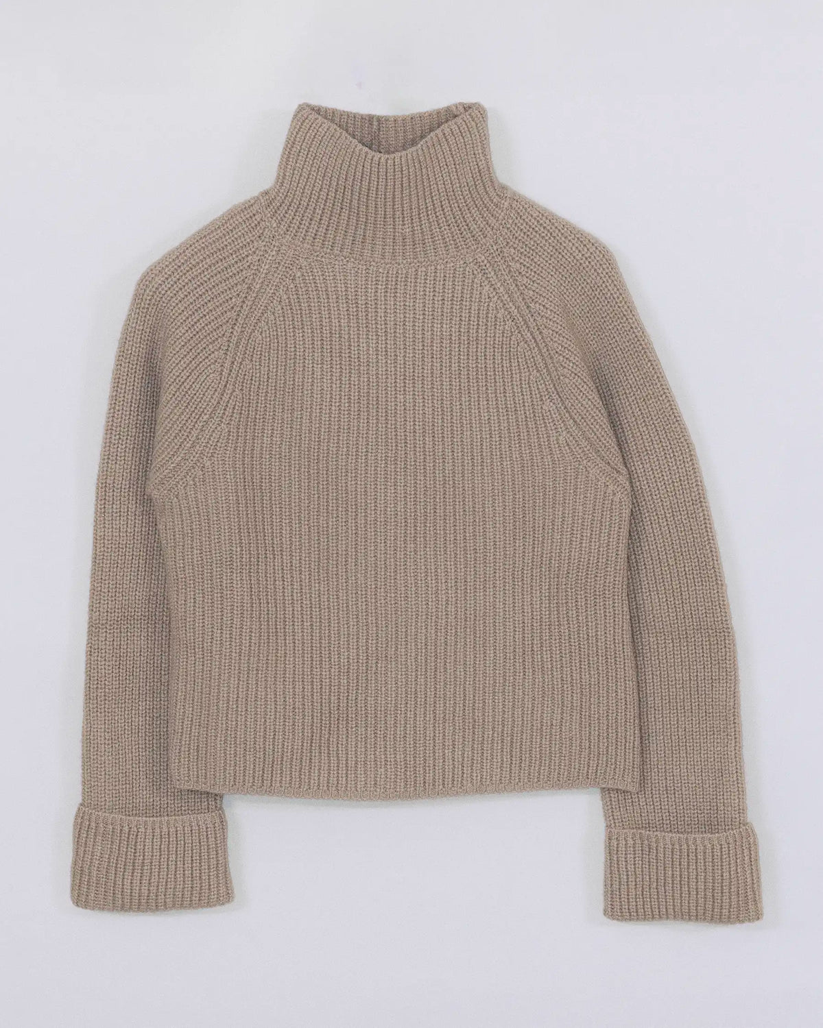 La spalla raglan offre una vestibilità comoda e moderna, garantendo libertà di movimento, mentre la lavorazione a costa inglese aggiunge un tocco di texture e profondità al filato. I polsi sono arricchiti da un particolare risvolto, che aggiunge un dettaglio moderno e contemporaneo. Realizzato con una pregiata miscela di lana merino e cashmere, questo maglione offre un calore eccezionale e una morbidezza lussuosa, ideale per affrontare le giornate più fredde.