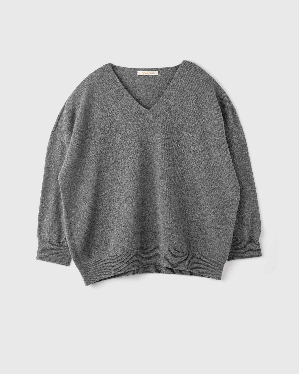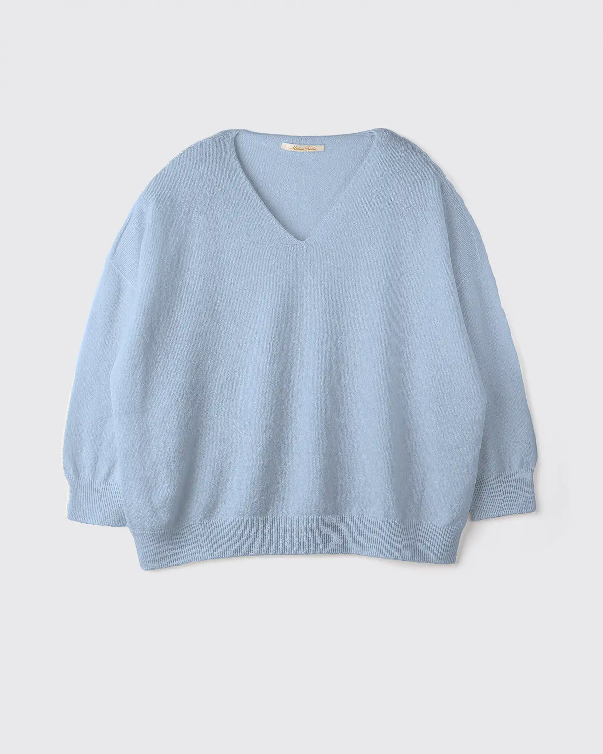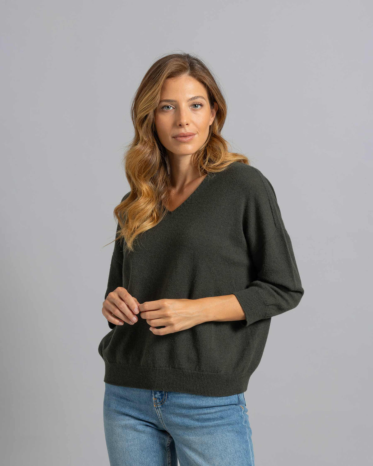 Maglia con scollo a V in lana merino e cashmere, rifinita con lavorazione a costine sul fondo e polsini. Un capo essenziale ma a suo modo sofisticato, caratterizzato da una vestibilità a scatolina con spalla scesa e da maniche 7/8, pensato per esaltare la tua femminilità e per diventare protagonista dei tuoi outfit di ogni stagione.