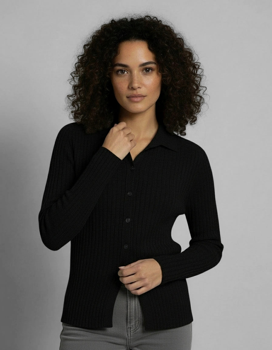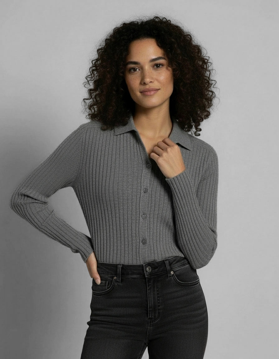 Raffinata e confortevole, questa camicetta a costina è realizzata interamente in cashmere di altissima qualità. Il design classico con chiusura a bottoni e il particolare collo a polo si sposano con la finezza del cashmere, offrendo un’esperienza di lusso e morbidezza al tatto. Disponibile in tre tonalità, è un capo versatile e pratico, ideale per completare outfit sia casual che più formali.