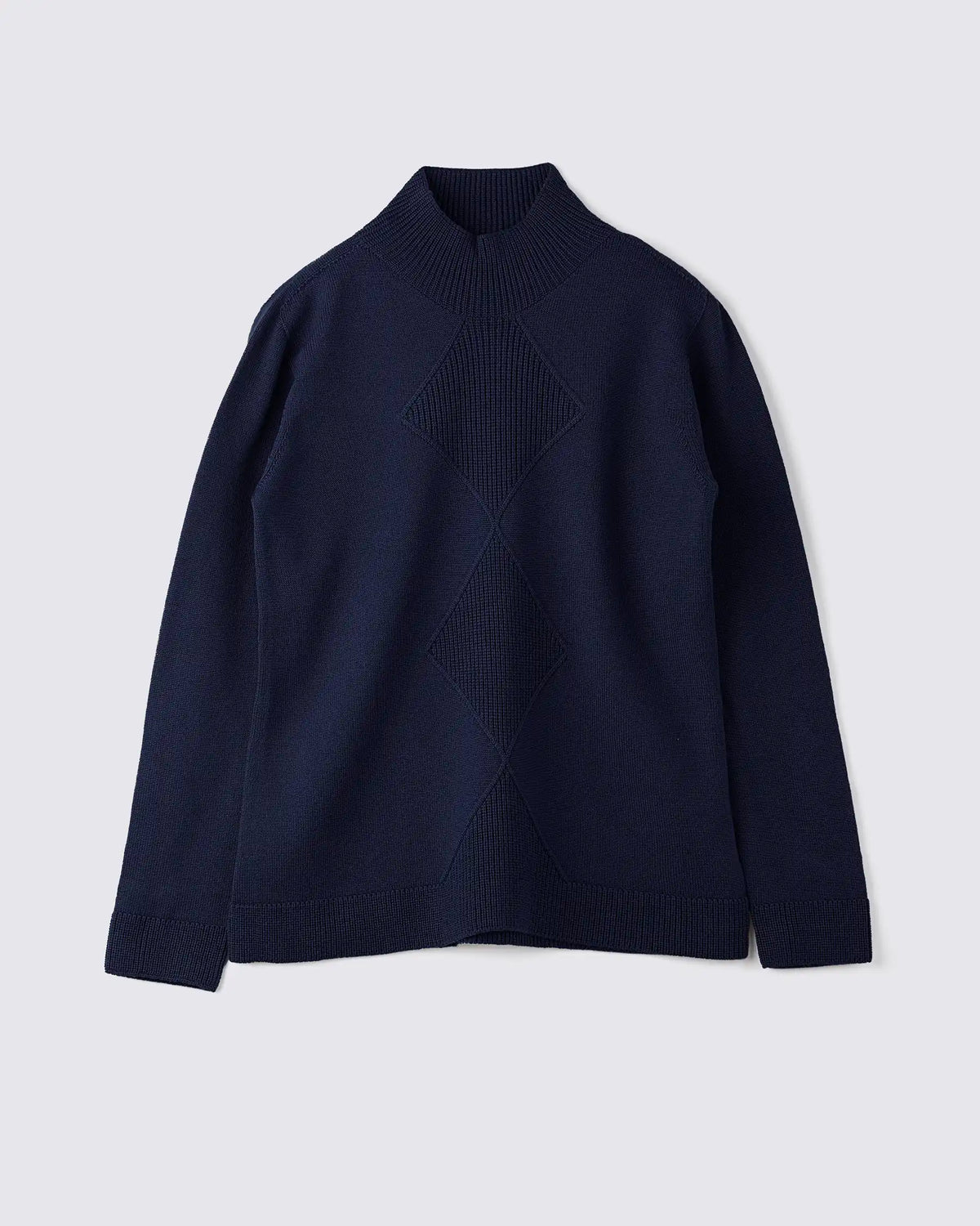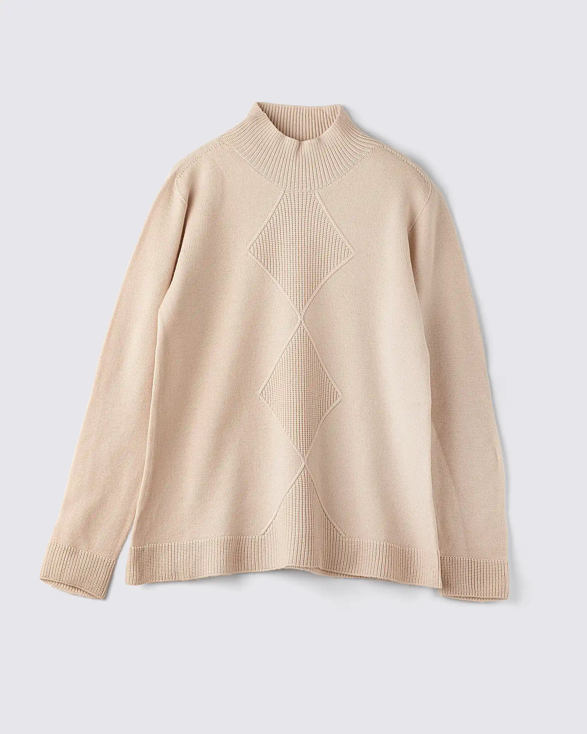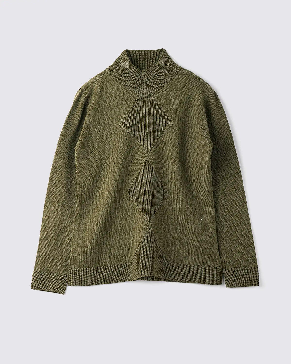 Il lupetto in pura lana merino con lavorazione a losanga rappresenta un equilibrio perfetto tra eleganza e comfort. Caratterizzato da un collo alto aderente, tipico del lupetto, avvolge il collo con delicatezza senza risultare eccessivamente stretto, offrendo calore e protezione durante i mesi più freddi.